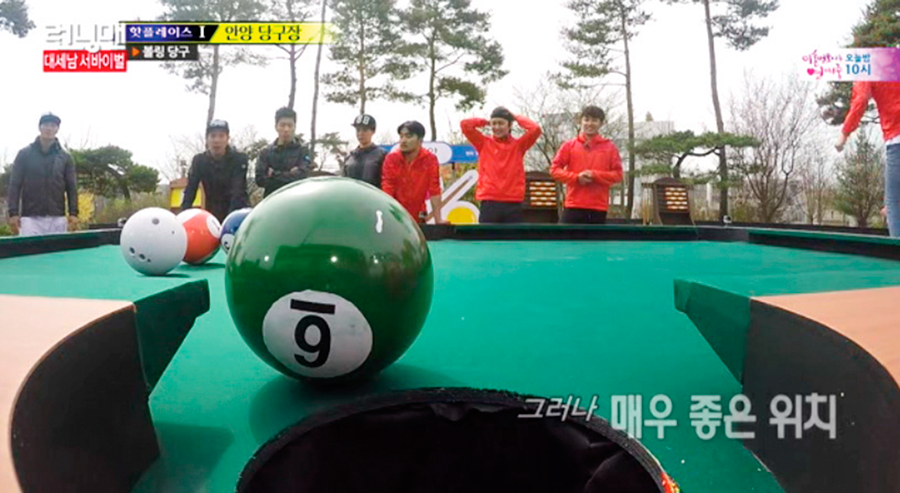 ‘안양당구장’ 세트에서의 첫 번째 게임은 포켓볼 게임이었다. 실제 당구용품들이 세팅된 세트에 들어선 출연진들은 엄청난 사이즈의 당구대에 놀라지 않을 수 없었다. 스눅볼에서나 볼 수 있었던 초대형 당구대가 설치된 것. 하지만 축구공 대신 볼링공이 당구공을 대신하고 있었다.