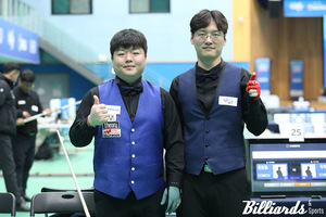 [빌리어즈=양구/김민영 기자] 조명우-윤도영(서울)이 올해 첫 대회였던 ‘국토정중앙배 전국당구대회’ 캐롬 3쿠션 복식전 우승에 이어, 올해 마지막 전국대회인 ‘대한체육회장배’에서도 정상에 오르며 2025년의 시작과 끝을 장식했다.19일 강원도 양구군 청춘체육관에서 열린 ‘제20회 대한체육회장배 2025 전국당구대회’의 시작을 알린 3쿠션 복식전에서 조명우-윤도영은 김진열-임준혁(경기)을 18이닝 만에 30:29로 누르고 우승을 차지했다.조명우-윤도영은 8강에서 권민수-서창훈(경기)을 30:17(22이닝)로 꺾은 뒤, 4강에서도 김도