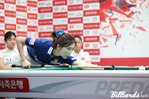 [빌리어즈앤스포츠=고양/이용휘 기자] 18일 '웰컴저축은행 PBA 팀리그 2025-26' 2라운드 2일차에 PBA 라운지에서 NH농협카드 NHpay와 에스와이 빌더스가 만났다. 전날 2라운드 1일차 대결에서 휴온스와 크라운해태에게 1패씩을 안고 출발한 에스와이와 NH농협카드는 1승을 차지하기 위한 치열한 접전을 벌였다. 사진은 2세트 여자복식에 출전한 NH농협카드의 정수빈이 진지하게 공을 겨냥하고 있다. (사진=고양/이용휘 기자)