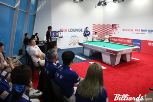 [빌리어즈앤스포츠=고양/이용휘 기자] 18일 '웰컴저축은행 PBA 팀리그 2025-26' 2라운드 2일차에 PBA 라운지에서 NH농협카드 NHpay와 에스와이 빌더스가 만났다. 전날 2라운드 1일차 대결에서 휴온스와 크라운해태에게 1패씩을 안고 출발한 에스와이와 NH농협카드는 1승을 차지하기 위한 치열한 접전을 벌였다. 사진은 PBA 라운지에서 대결을 벌이고 있는 NH농협카드와 에스와이. (사진=고양/이용휘 기자)