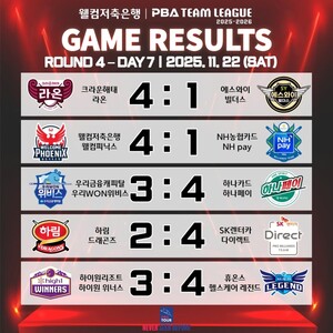 [빌리어즈=김도하 기자] 프로당구 PBA 팀리그 4라운드 7일 차 경기에서 크라운해태, 웰컴저축은행, 하나카드, SK렌터카, 휴온스가 승리했다.22일 낮 12시 30분에 경기도 고양시의 '고양 킨텍스 PBA 스타디움'에서 열린 '웰컴저축은행 PBA 팀리그 2025-2026' 4라운드 7일 차 경기에서 크라운해태는 세트스코어 4-1로 에스와이를 꺾고 4연승을 달렸다.크라운해태는 4라운드에서 3일 차에 SK렌터카전을 제외하고 나머지 6경기를 모두 승리해 6승 1패(승점15)로 2위에 오르며 우승 도전을 이어갔다.전날 하림을 4-1로 꺾