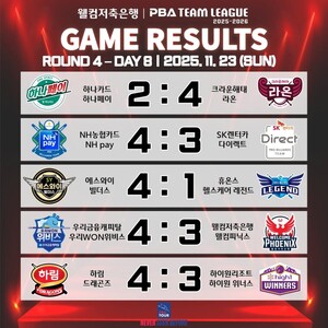 [빌리어즈=김도하 기자] 프로당구 PBA 팀리그 4라운드 8일 차 경기에서 크라운해태, NH농협카드, 에스와이, 우리금융캐피탈, 하림이 승리했다.23일 낮 12시 30분에 경기도 고양시의 '고양 킨텍스 PBA 스타디움'에서 열린 '웰컴저축은행 PBA 팀리그 2025-2026' 4라운드 8일 차 경기에서 크라운해태는 하나카드를 세트스코어 4-2로 제압했다.크라운해태는 전날까지 4라운드 순위 2위에 올라 1위 SK렌터카, 3위 하나카드와 마지막까지 우승트로피를 놓고 경쟁하고 있다.이번 승부는 2위와 3위 팀 중 한 팀만 최종 우승 경쟁