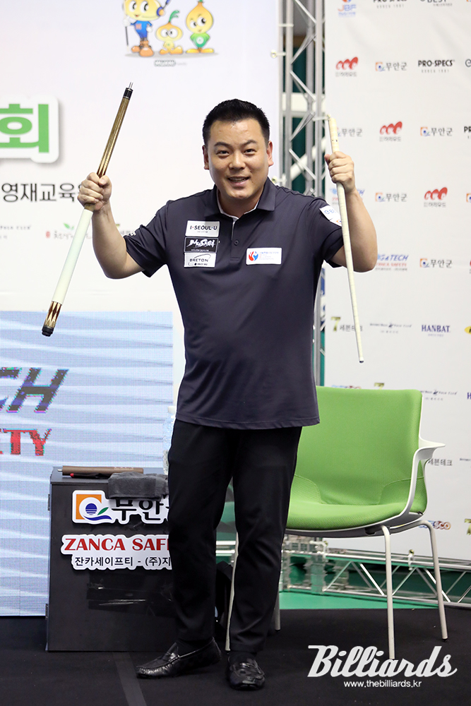 [빌리어즈=김주석 기자] 15일 무안종합스포츠파크 실내체육관에서 열린 '2019 무안황토양파배 전국당구선수권' 캐롬 3쿠션 전문선수 남자부 개인전 결승에서 승리한 조재호(서울시청)가 우승 세레머니를 하고 있다.