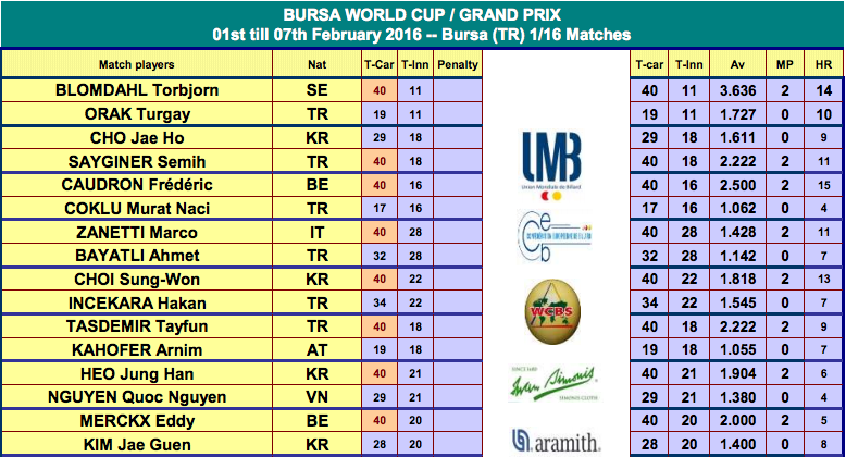 프레데릭 쿠드롱(벨기에)은 홈 경기의 부담감을 떨치지 못한 무랏 나시 초클루를 하이런 15점을 치며 16이닝 만에 40:17로 꺾었다.