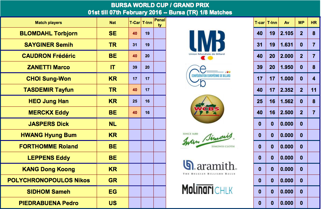 - 터키 부르사에서 2016년 첫 번째 3쿠션 월드컵이 시작된다.
