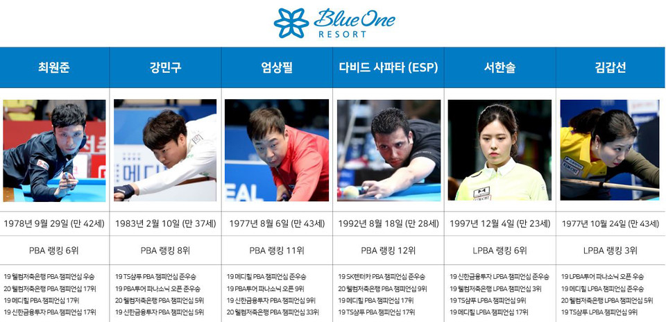 프로당구 제6구단 블루원 엔젤스에는 PBA 챔피언 최원준(랭킹 6위)을 비롯해 PBA 랭킹 8위 강민구와 11위 엄상필, 12위 다비드 사파타(스페인), LPBA 원년 챔피언 김갑선(랭킹 3위), 'LPBA 여신'으로 주목받은 서한솔(6위) 등 6명이 선발되었다.