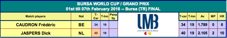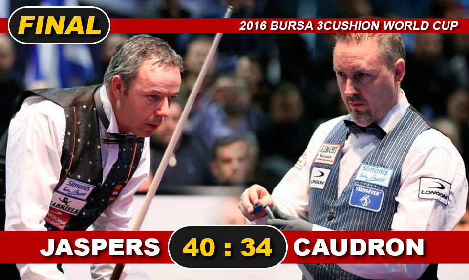 야스퍼스는 한국시각 7일 오후 11시에 벌어진 ‘2016 부르사 3쿠션 월드컵’ 결승전에서 벨기에의 프레데릭 쿠드롱을 19이닝 만에 40:34로 꺾고 우승을 차지했다.