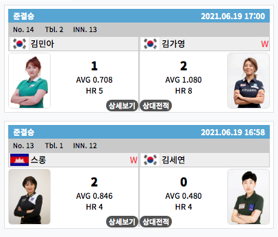 한편, 김가영은 첫 세트를 김민아에게 7:11(13이닝)로 패했으나 2세트를 단 4이닝 만에 11:3으로 끝내며 2.750의 애버리지를 기록했다.