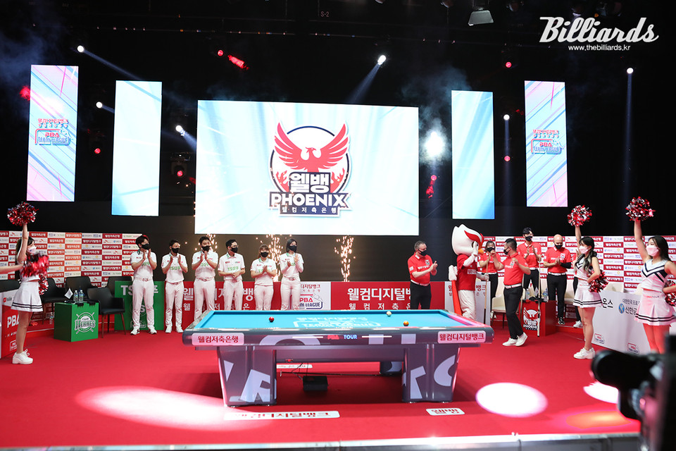 [빌리어즈=성지안 기자] '웰컴저축은행 PBA 팀리그 2021-2022'에 출전한 선수들이 치어리더들의 환호를 받으며 화려하게 입장하고 있다.