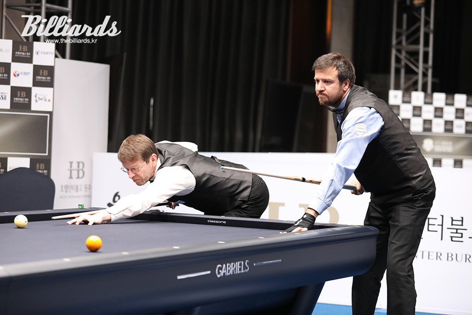 [빌리어즈=김민영 기자] ‘호텔 인터불고 원주 3쿠션 그랑프리’의 8강 리그전 마지막날 대결이 펼쳐지고 있는 가운데 토브욘 블롬달(스웨덴)과 뤼피 체넷(터키)이 본 경기에 앞서 공격 선수를 정하기 위해 뱅킹을 시도하고 있다.