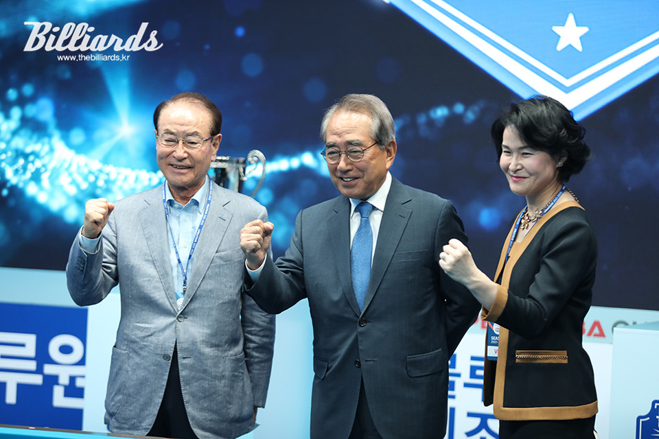 왼쪽부터 태영그룹 윤세영 창업회장, PBA 김영수 총재, 블루원리조트 윤재연 대표이사.