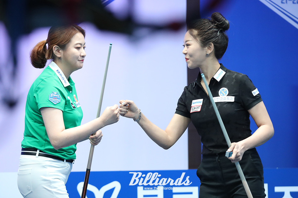 준결승 경기에 앞서 김민아와 김가영이 인사를 나누고 있다.