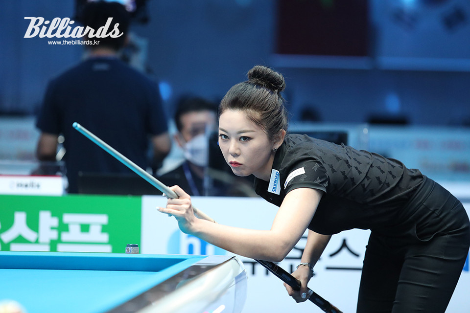 포켓볼 세계 챔피언 출신의 김가영이 포켓볼 선수 특유의 낮은 자세를 3쿠션에 접목하며 적응을 마친 모양새다.