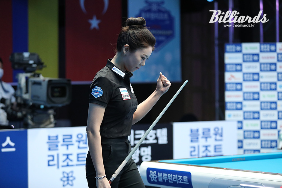마지막 샷의 성공이 확실해지자 가만히 주먹을 쥐며 스스로를 격려하는 김가영.