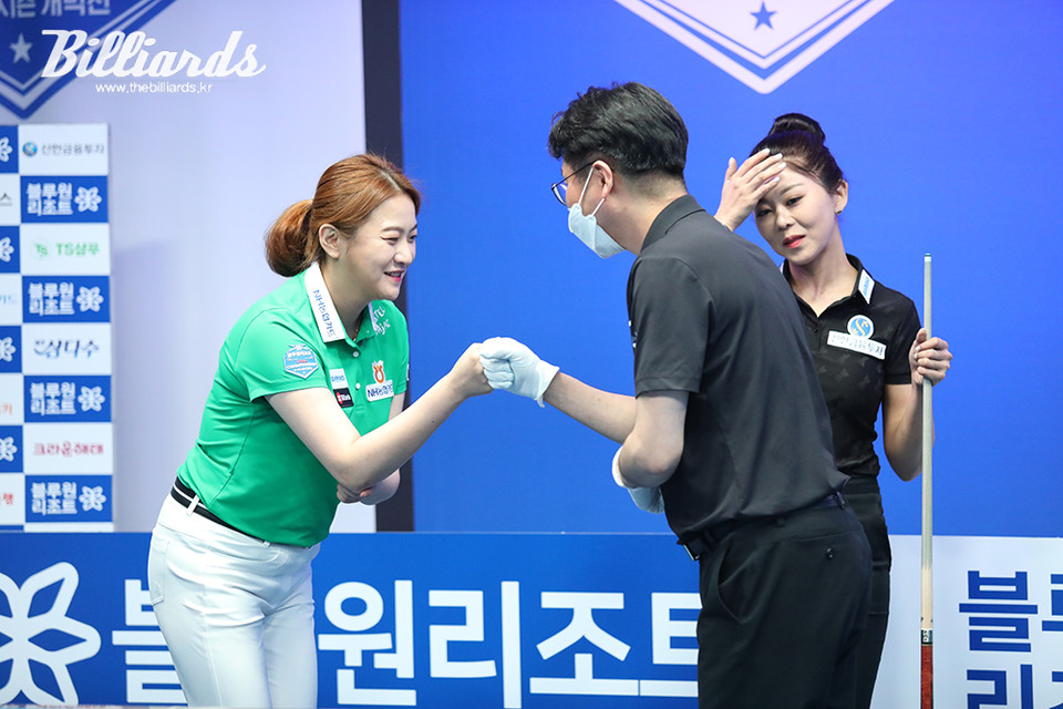 [빌리어즈=김민영 기자] '블루원리조트 PBA-LPBA 챔피언십'의 준결승전에 오른 김민아(NH농협카드)가 경기 후 심판과 인사를 나누고 있다.