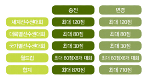 국가별 선수권대회 점수는 1위 30점, 2위 18점, 3~4위 12점, 5~8위 7점, 9~16위 4점, 17~32위 2점 등이다. 올해부터는 월드컵 포인트를 종전 8개 대회 합산에서 6개 대회 합산으로 줄여 순위 다툼이 더욱 치열해질 전망이다.