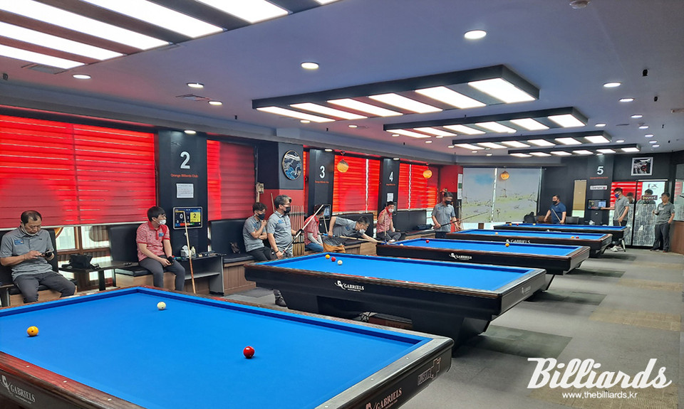 사진은 경기도 평택시 캐롬 B리그 대회가 열리고 있는 오렌지당구클럽 현장의 모습이다. 빅박스 팀과 오렌지 팀이 대결을 벌이고 있다.