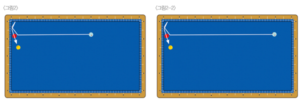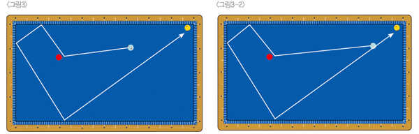 <그림3>과 <그림3-3>은 수구의 1쿠션 지점이 인위각이므로 충분한 가속도가 필요하다. 따라서 커브보다는 스쿼트를 주의해야 한다. <그림3-3>의 경우 <그림3>보다 수구와 제1적구 간의 거리가 멀어졌으므로 예상보다 두껍게 오조준하고 타구하여야 한다.