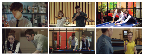 레슨을 위해 차유람을 만난 에릭은 선수를 보내랬더니 어디서 예쁜 여자애를 보냈냐며 선배를 타박하지만 곧 차유람의 실력을 보고는 시원하게‘나이스 샷’을 외치는 것이 이 장면의 포인트. 성준과 에릭의 당구 시합 장면과 차유람이 에릭에게 당구 레슨을 해주는 장면은 제법 오랜 시간에 걸쳐 드라마에 등장한다. 그만큼 당구가 두 남자의 미묘한 신경전을 잘 표현해주기 때문이다.