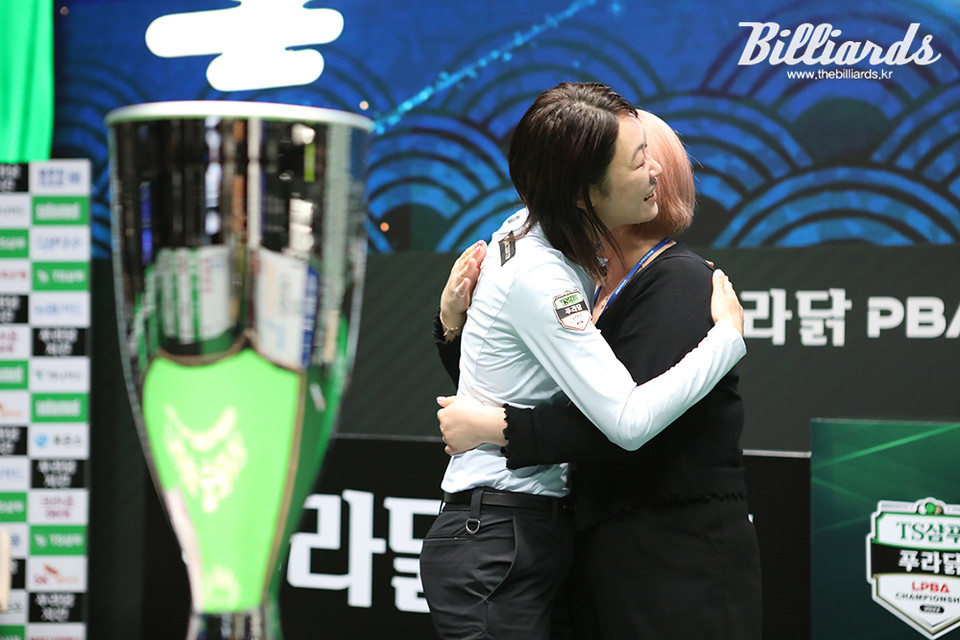 시상식 후 김예은(웰컴저축은행)이 히다 오리에를 눈물로 축하하자 히다가 김예은을 다독이고 있다.