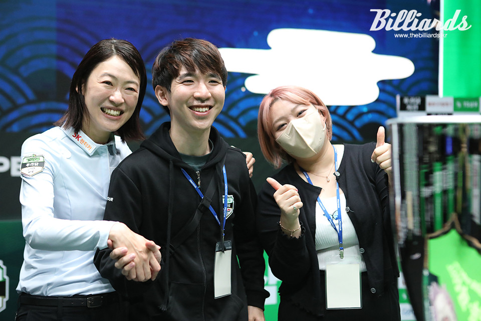 시상식 후 일본 선수로서 PBA 투어에서 활약하고 있는 모리 유스케와 손을 꼭 잡은 히다 오리에가 김예은과 함께 기념사진을 찍고 있다.