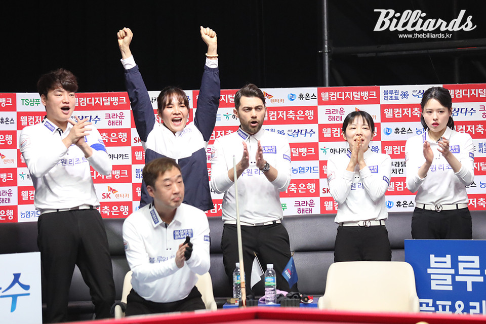 1세트 남자복식에서 블루원리조트의 다비드 사파타(스페인)와 엄상필이 웰컴저축은행의 프레데릭 쿠드롱(벨기에)과 비롤 위마즈(튀르키예)를 상대로 11:1(5이닝)로 승리하자 블루원리조트 벤치에서 응원하던 스롱 피아비(캄보디아)가 두 손을 번쩍 들고 기뻐하고 있다.