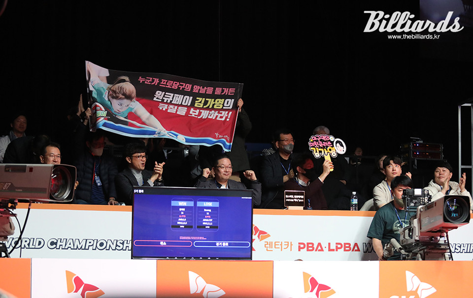 김가영과 스롱 피아비의 소속 팀 하나카드와 블루원리조트의 응원 열기도 뜨겁다. 사진은 김가영을 응원하는 하나카드 응원단.
