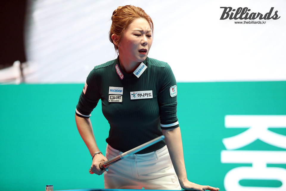 득점을 놓친 김가영이 아쉬운 표정을 짓고 있다.
