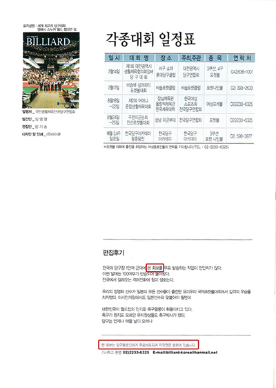 1. 발행처가 전국당구연합회, 발행인이 단체 회장인 박종화로 등록된 잡지로 소유권은 단체에 있는 것이고, 서울시의 행정처분을 받아 제호를 바꿔 2008년 12월에 다시 등록할 당시에 협회에서 발행하는 모든 요건을 갖춰서 등록 후 발행한 것이다.