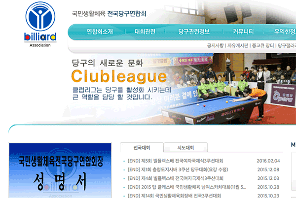 <국민생활체육 전국당구연합회장 성명서> 당구도 얼마 전 대한당구연맹의 비리가 사실로 밝혀져 언론에 보도되었고, 본 연합회도 방기송 전 사무처장의 횡령 비리 혐의로 인한 파면 이후에 벌어지고 있는 내홍으로 계속해서 몸살을 앓고 있는 것이 사실입니다. |