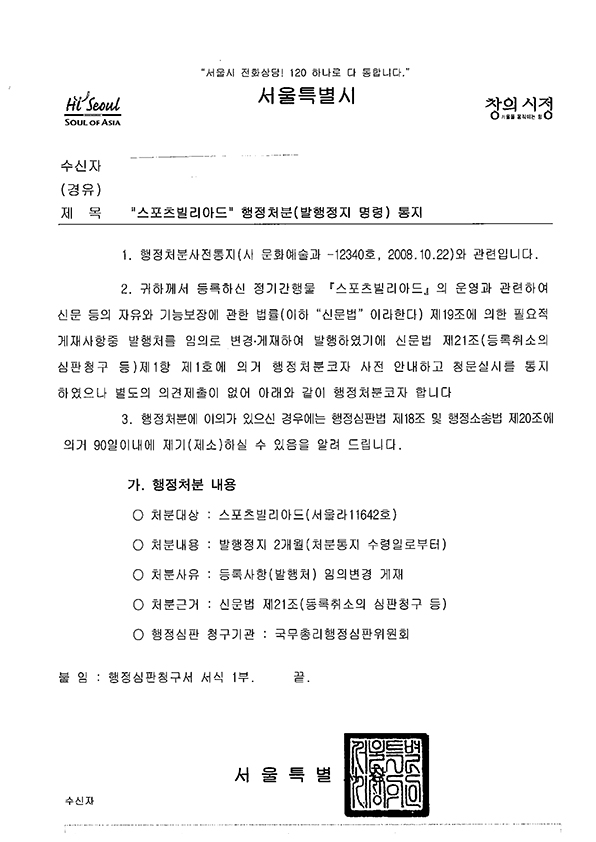 현행 ‘정기간행물의 등록에 관한 법률’에는 “법인 또는 기타 단체나 기관이 그 소속원에게 무료로 보급할 목적으로 발행하는 경우”의 회보에는 “대표이사 또는 대표자를 발행인으로 해야 한다”라고 규정되어 있음에도 불구하고, 판권란에 발행인을 표시하지 않은 것과 등록되어 있는 발행처와 다른 ‘국민생활체육 전국당구연합회’를 명시하여 발행한 것을 수상하게 여긴 본지에서 이에 대해 취재하면서 2008년 10월에 <월간 스포츠빌리아드>는 주무관청인 서울특별시로부터 ‘발행정지 2개월’의 행정처분을 받게 되었다.