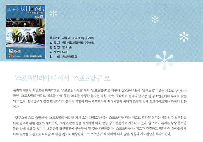 발행인을 정미혜라는 인물로 등록한 <월간 스포츠빌리아드>는 2007년 9월호까지 총 12호가 발행되었다가 폐간했고, 2007년 10월에 제호는 동일하게 <월간 스포츠빌리아드>로 하고 ‘발행인 방기송, 편집인 방기송’, 발행처가 인근의 주소지로 변경된 채 다시 등록하여 2008년 11월호까지 총 13호를 발행했다.