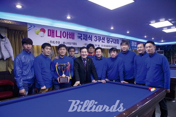 두 번째 클럽연합 3쿠션 팀토너먼트가 열렸다. 15개 클럽에서 총 43개 팀이 출전하여 지난 2월 9일 여의도 CV클럽에서 열린 이번 대회에서는 신예 매니아클럽이 25년 전통의 청엽클럽을 승부치기 끝에 누르고 대망의 우승을 차지했다.