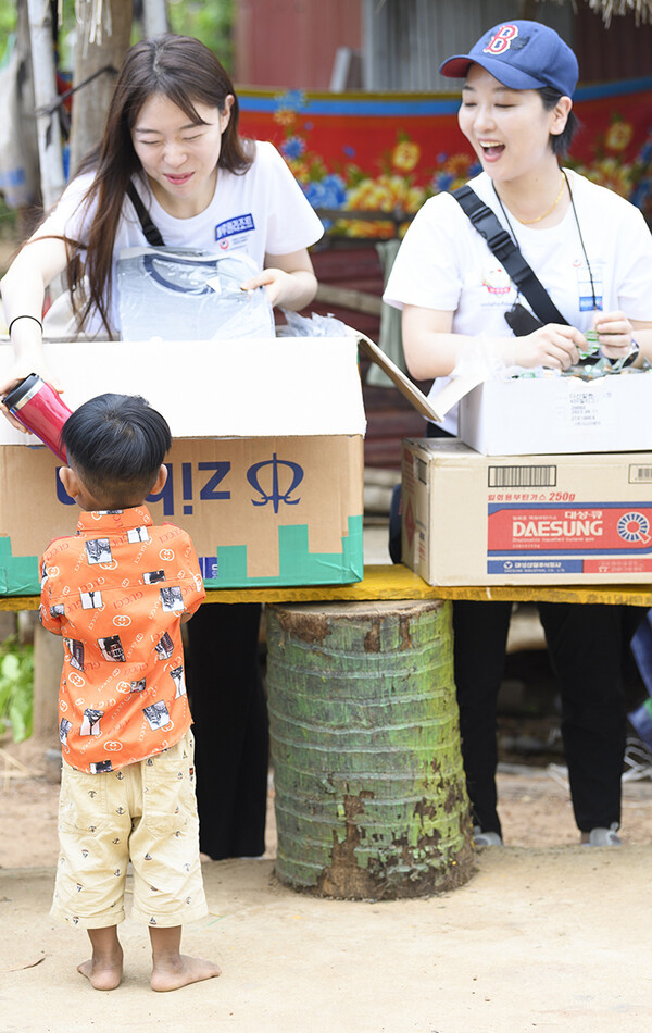 사진은 캄풍톰크라베이초등학교에서 아이들에게 깨끗한 물통과 구충제 등 선물을 나눠주는 김보라(왼쪽)와 이유주(오른쪽).