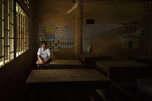 사진은 자신의 고향에 있는 모교 초등학교 교실에서 책상에 앉아 생각에 잠긴 스롱.