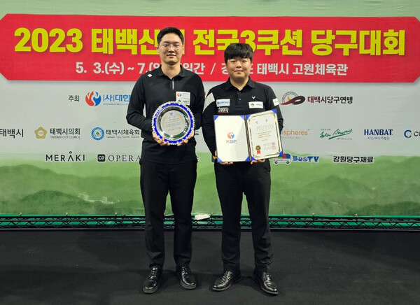 지난 5월 3일 강원도 태백시 고원체육관에서 열린 '2023 태백산배 전국3쿠션당구대회' 첫날 캐롬 3쿠션 복식전 결승에서 서울의 조명우(실크로드시앤티-서울시청)-윤도영이 경기도의 박근형-정역근 팀을 20이닝 만에 30:21로 꺾고 우승을 차지했다.