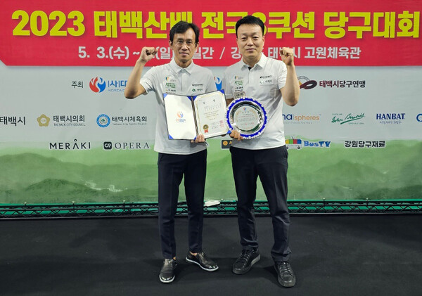 지난 5월 3일 강원도 태백시 고원체육관에서 열린 '2023 태백산배 전국3쿠션당구대회' 첫날 캐롬 3쿠션 복식전에서 박근형-정역근 팀이 준우승을 차지했다.