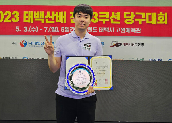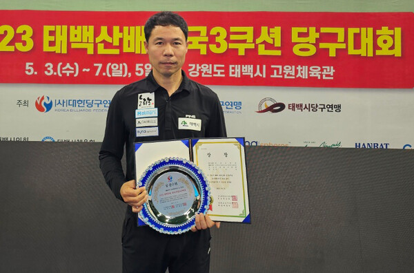 6일 강원도 태백시 고원체육관에서 열린 '2023 태백산배 전국3쿠션당구대회' 전문선수부 3쿠셔 남자 개인전에서 '국내랭킹 1위' 김행직(전남)과 '국내 3위' 허정한(경남)이 나란히 공동 3위에 입상했다.