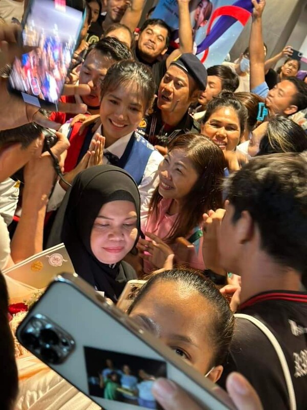 '제32회 2023 동남아시아게임(32nd SEA GAMES, CAMBODIA 2023)' 여자 3쿠션 종목에서 금메달을 딴 '캄보디아 당구 영웅' 스롱 피아비(33·블루원리조트)가 경기장 앞에서 많은 인파에 둘러싸여 있다.