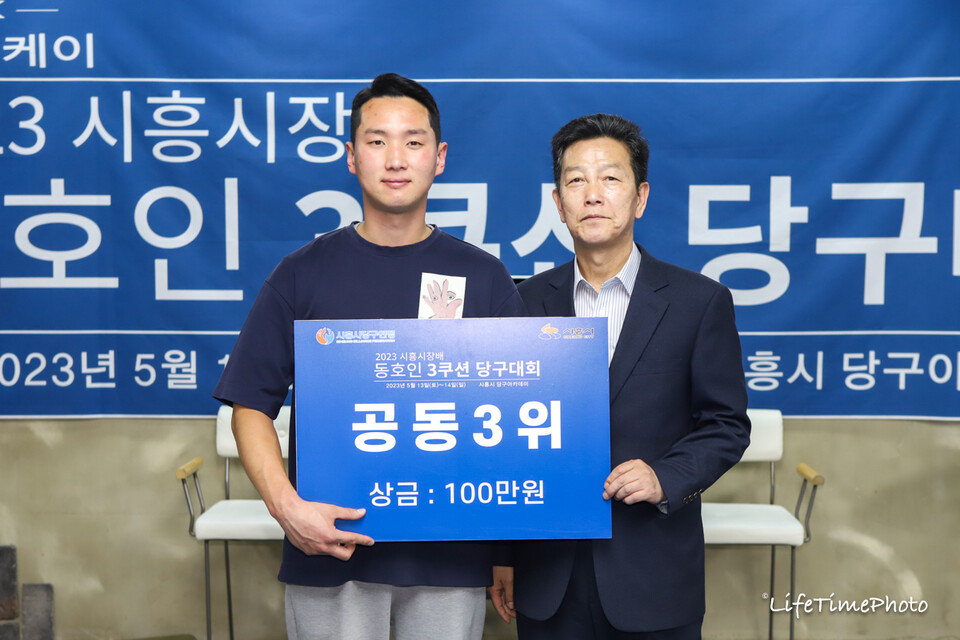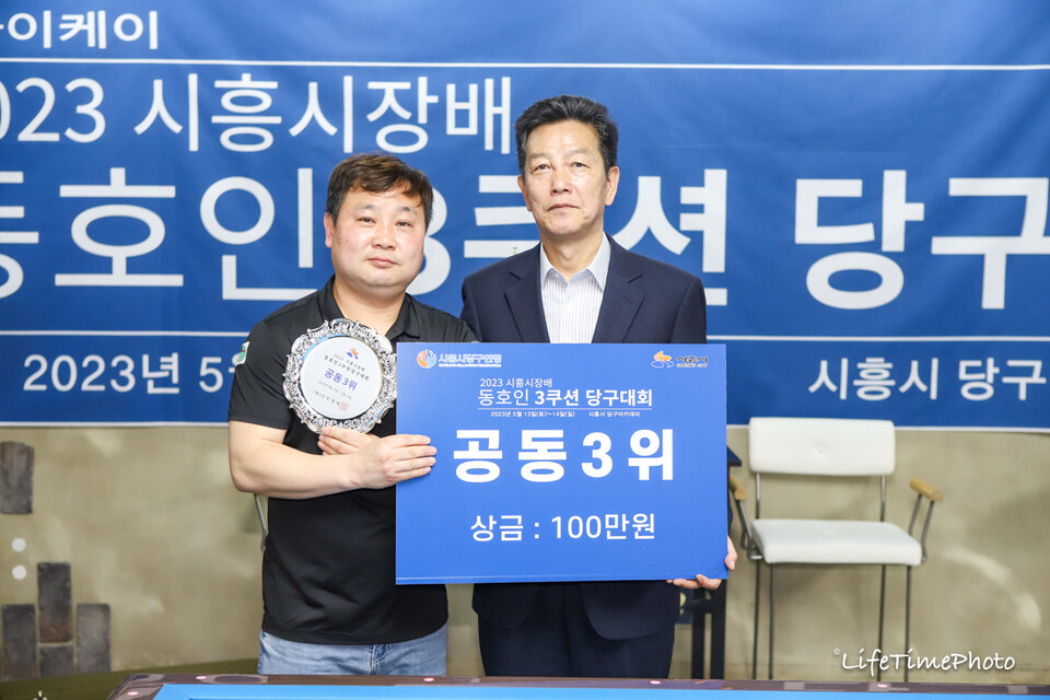 사진은 공동3위를 차지한 배창진(위, 인천MBC)과 조철훈(아래, 빌포텐). 시상자는 시흥시당구연맹 김종근 회장.