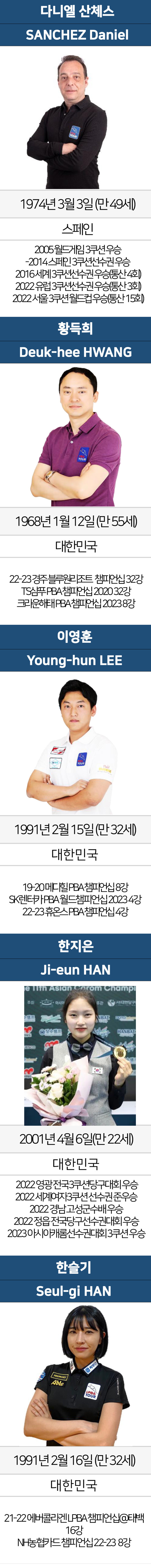 한편, 오는 23일 오후 3시에 한국 프레스센터에서 열리는 '2023년도 PBA 팀리그 드래프트'에서 국내 유일 3쿠션 세계챔피언 최성원(46)과 한지은이 참석해 팀리그 선발 소감과 새 시즌을 맞는 각오 등을 밝힐 예정이다.