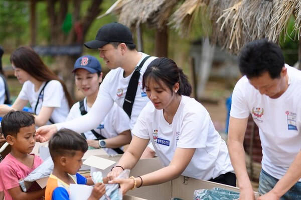 사진은 지난 4월 (사)피아비한캄사랑과 PBA-LPBA 당구선수들이 함께 동행한 캄보디아 봉사활동 중 아이들에게 선물을 나눠주고 있는 스롱과 (사)피아비한캄사랑 일행들. 스롱 옆으로 당구선수 노종현과 이유주 등의 모습도 보인다.