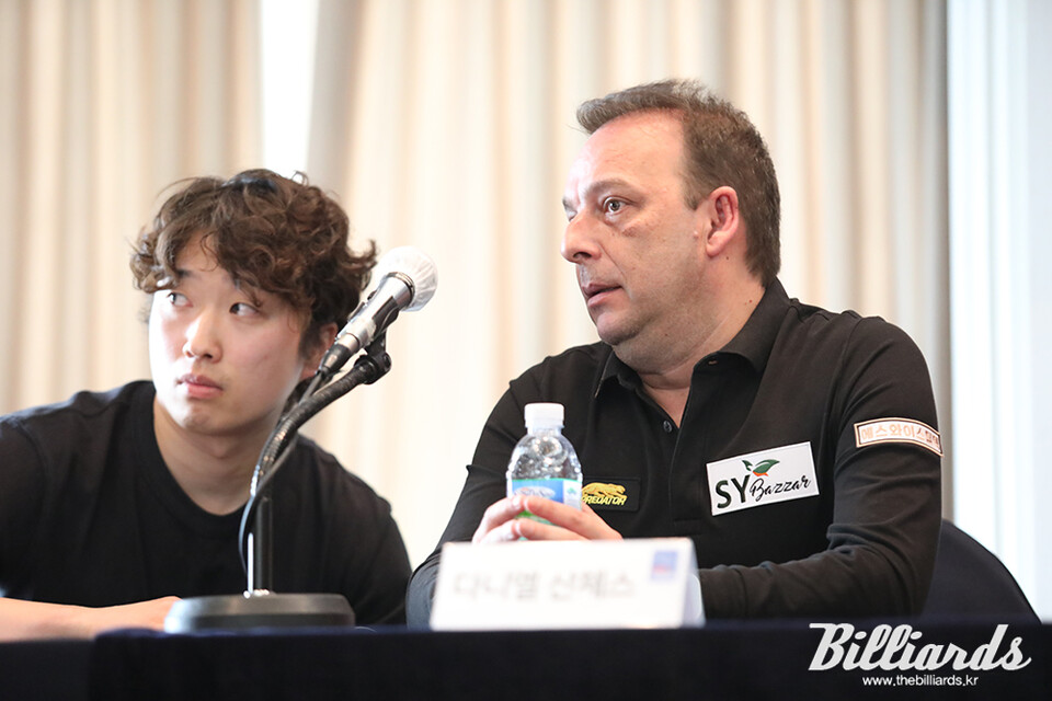 사진은 질문을 듣고 있는 다니엘 산체스와 통역을 도와주는 PBA 관계자(왼쪽).