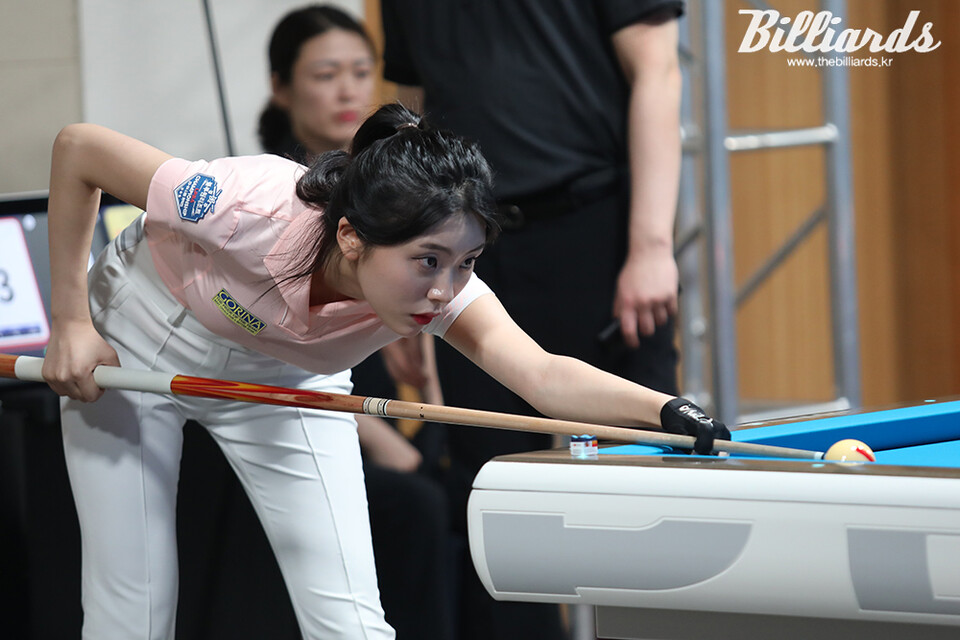 정수빈은 '경주 블루원리조트 LPBA 챔피언십' 예선 1라운드에서 유미형을 18:11(28이닝)로 꺾고 64강에 올랐다.