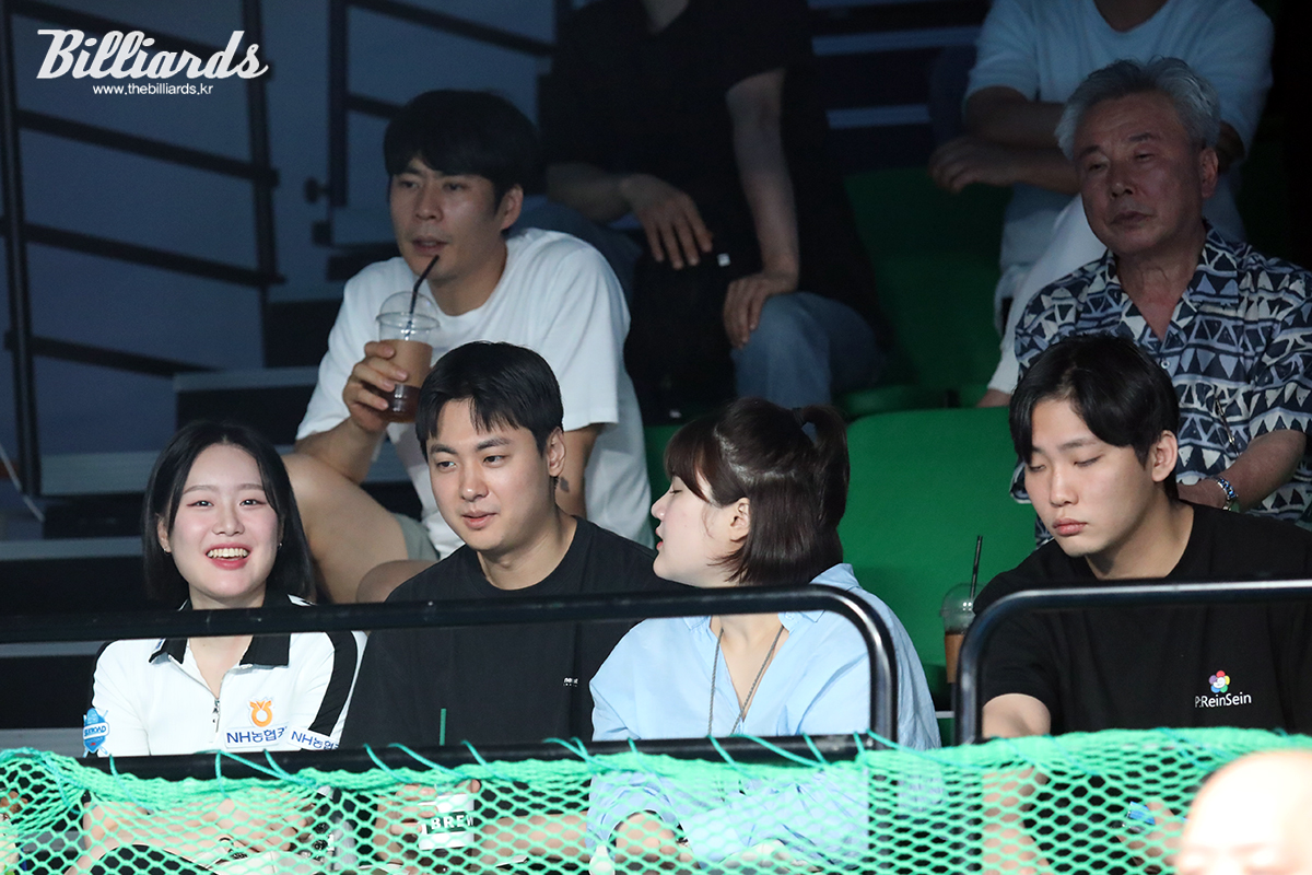 김보미(NH농협카드)와 신정주(하나카드)가 지난 3일 경기도 안산시 상록수체육관에서 열린 프로당구 23-24시즌 2차 투어 '실크로드&안산 LPBA 챔피언십' 64강에 출전한 김예은(웰컴저축은행)을 응원하기 위해 경기장을 찾았다.