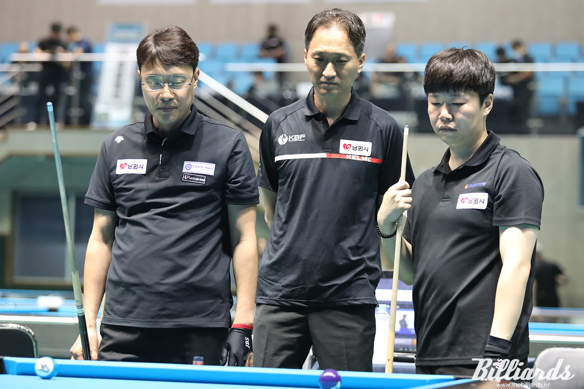 사진은 뱅킹 후 공의 위치를 확인하는 하민욱과 이종민. 가운데는 심판.