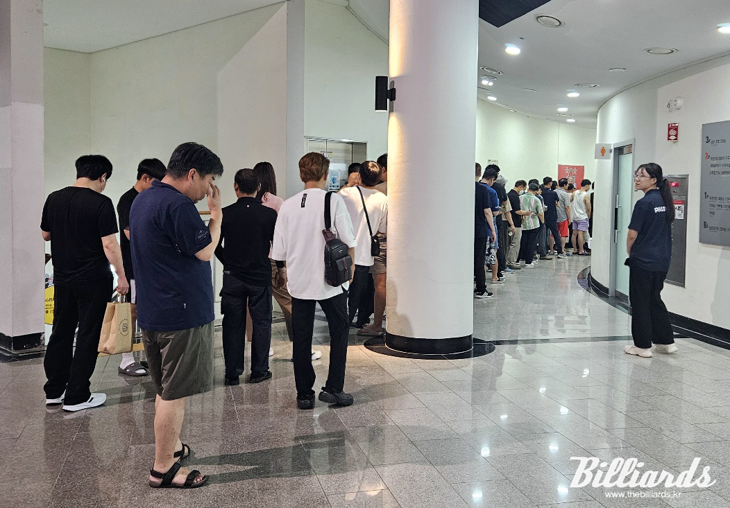 두 선수의 결승전을 보기 위해 늦은 시간임에도 불구하고 당구 팬들이 경기장 입장을 위해 긴 줄을 서 있다.
