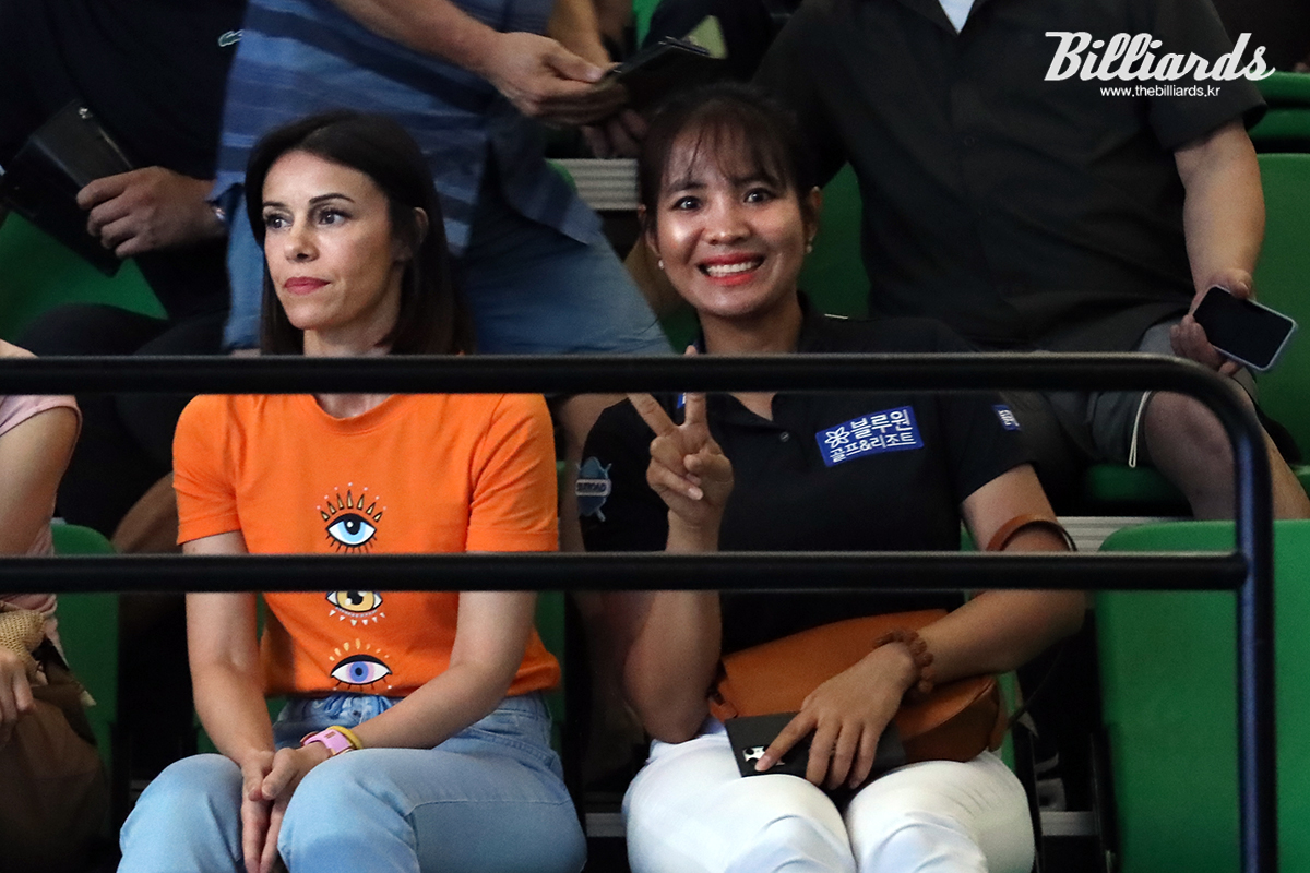 어제(9일) 열린 LPBA 결승전에서 용현지(하이원리조트)를 꺾고 6번째 LPBA 우승 타이틀을 차지한 스롱 피아비(캄보디아, 블루원리조트)가 대회장을 찾았다. 옆은 쿠드롱의 부인 아말 나자리.