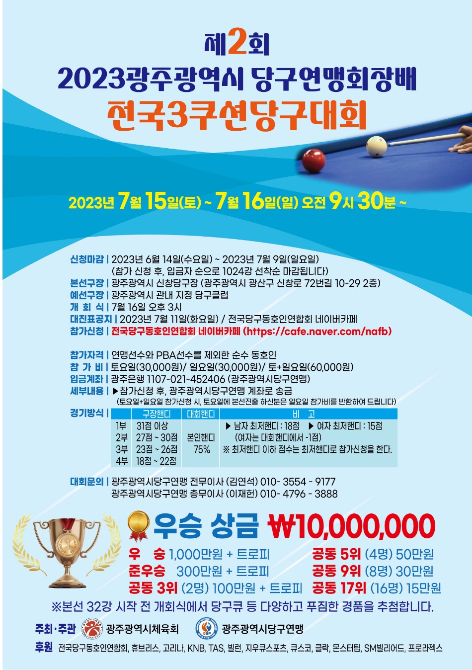 광주광역시체육회와 광주당구연맹이 주최하는 '제2회 2023 광주광역시당구연맹회장배 전국3쿠션당구대회'가 15, 16일 양일간 개최된다.