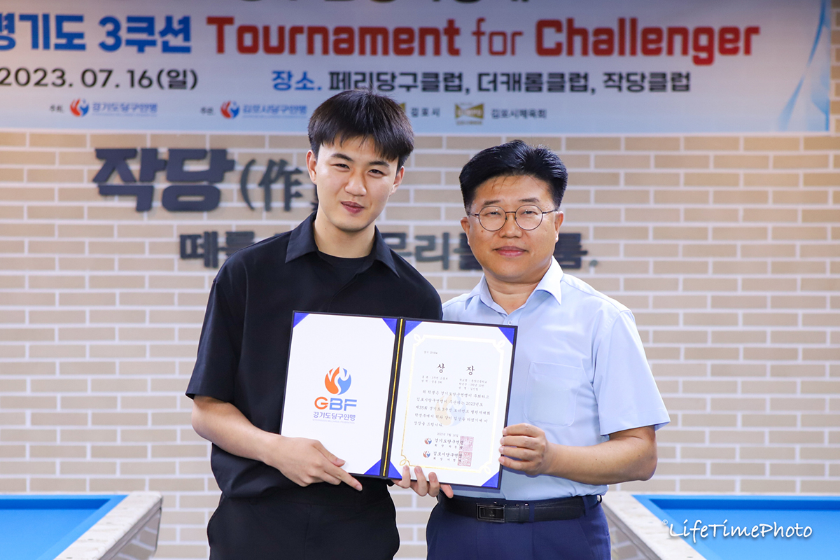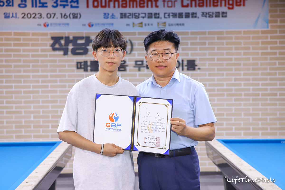 사진은 (위에서부터) 우승 김소원, 준우승 이서진, 공동3위 구동휘, 김민철. 옆은 김포시당구연맹 이명행 회장.